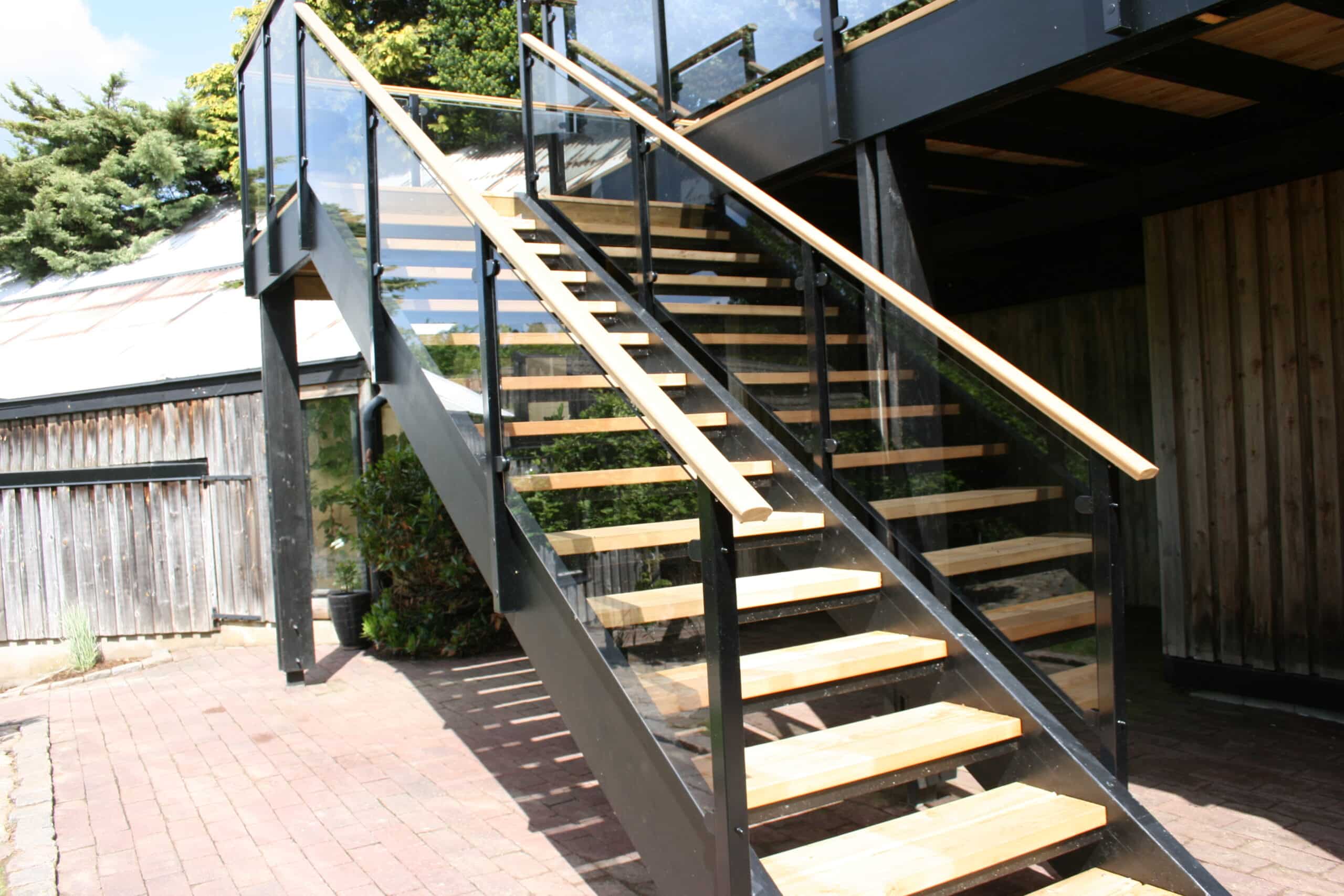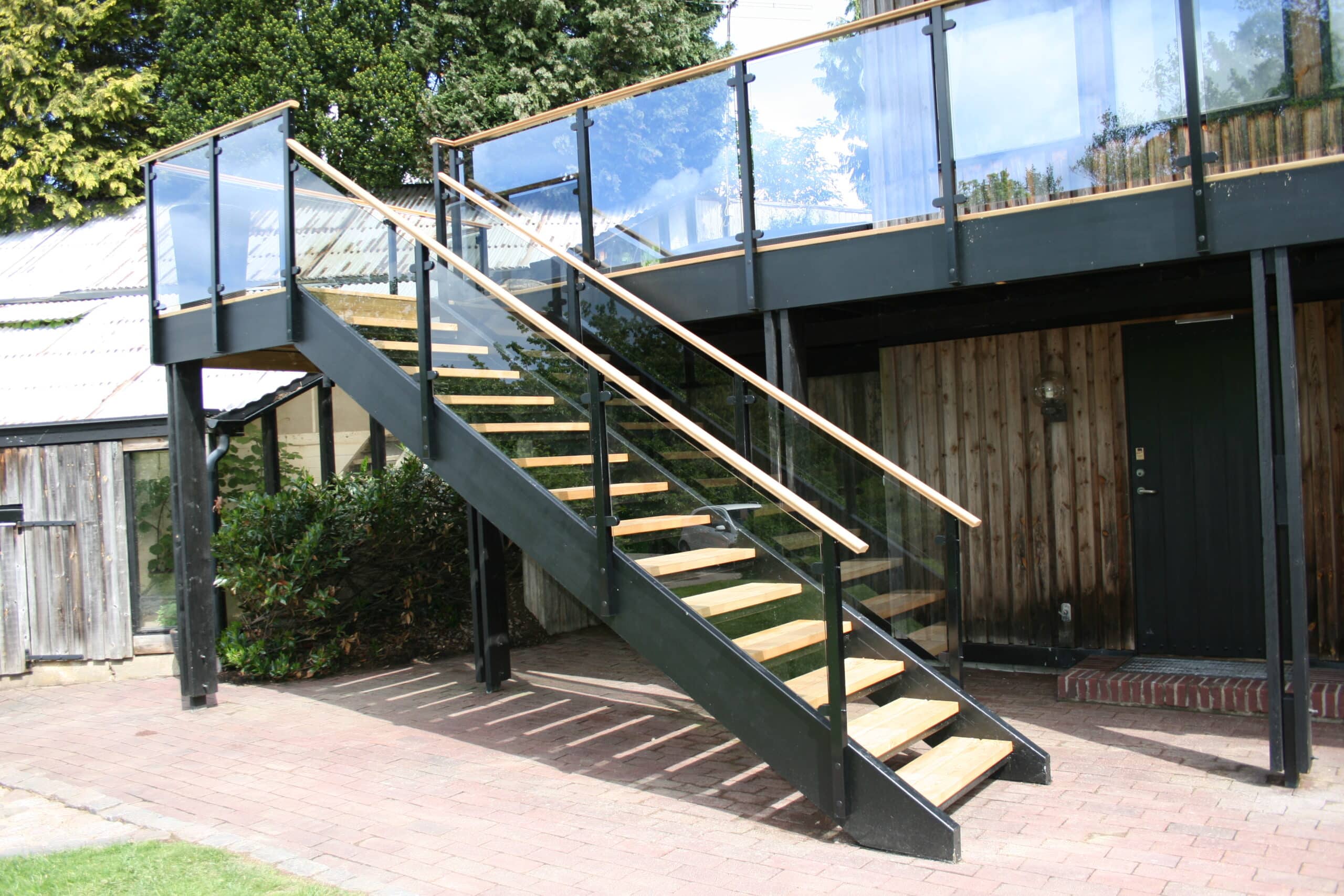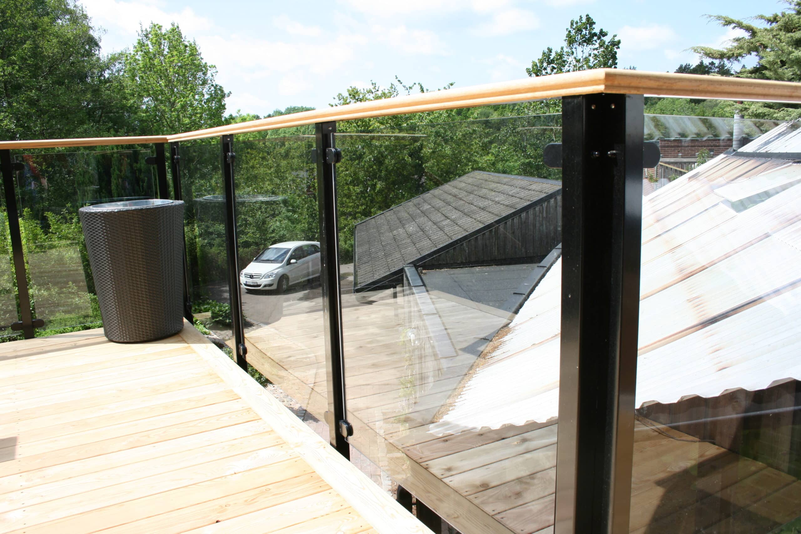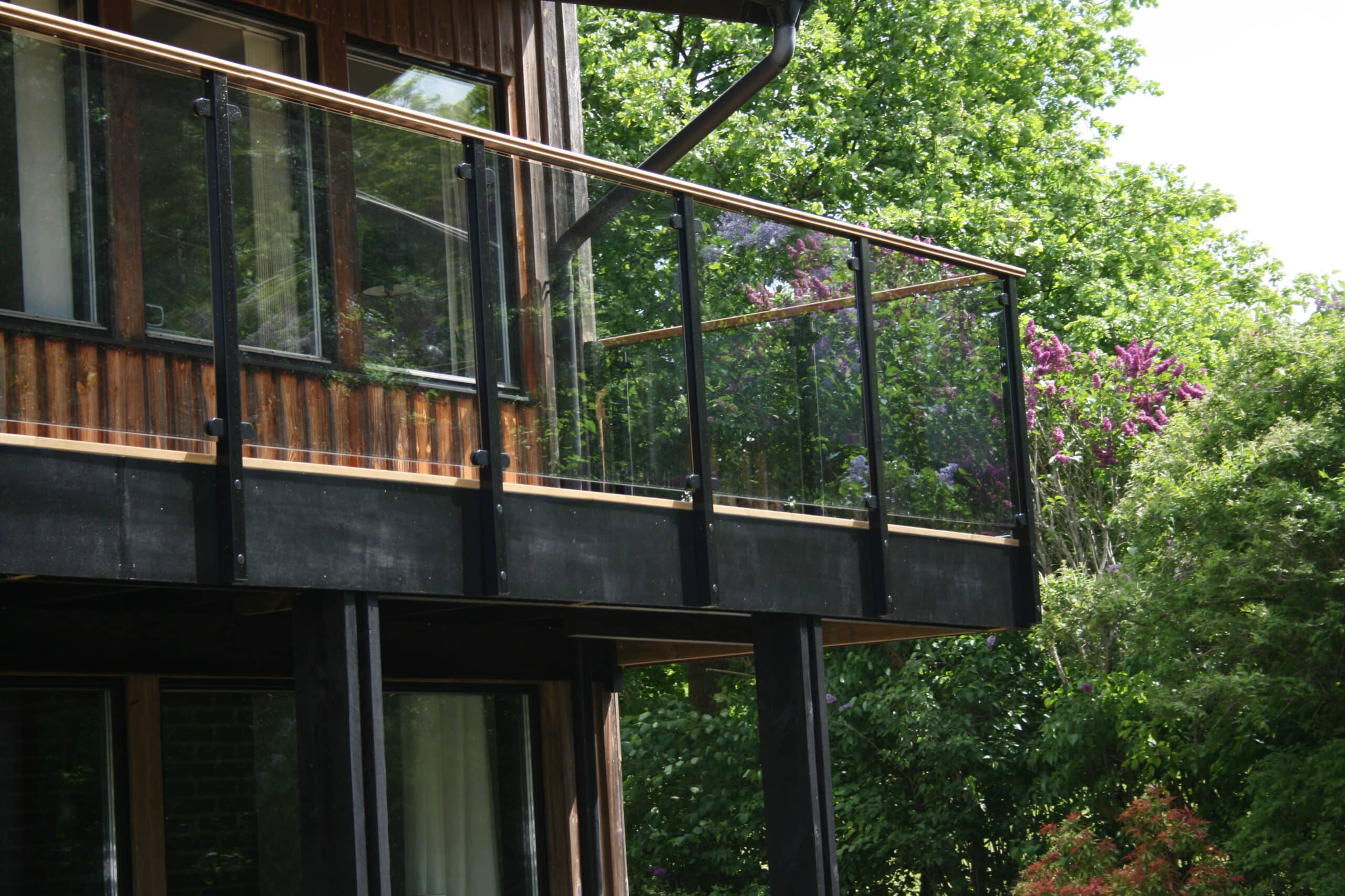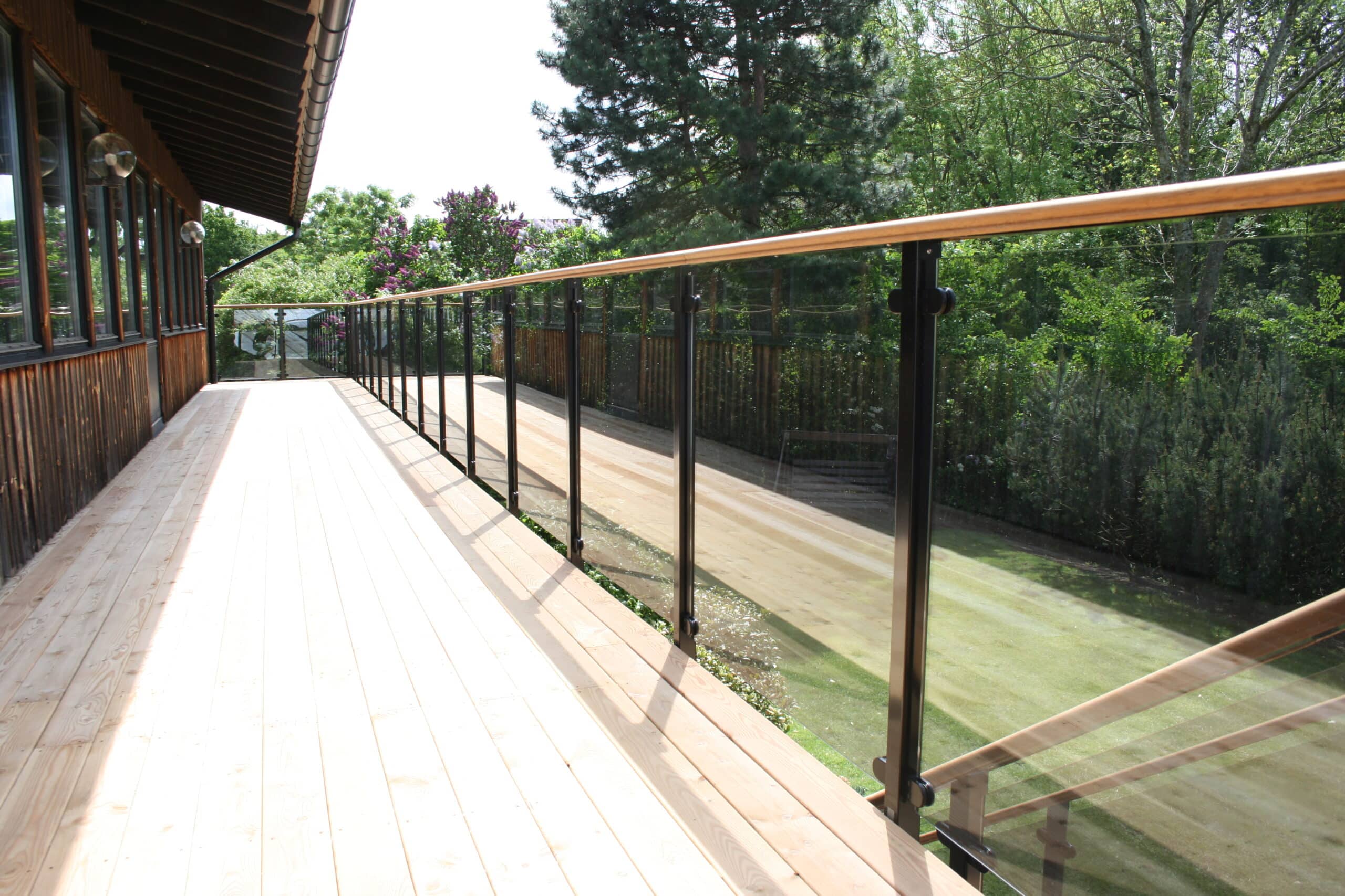 Räcket är av variant 1, med teaköverliggare, monterat utanpå & med klart glas, såväl på balkongen, som i trappan.